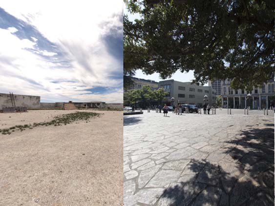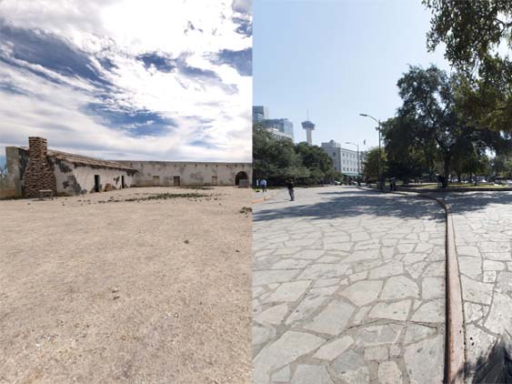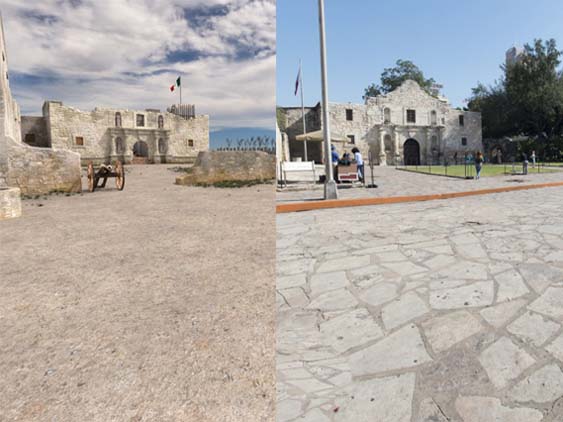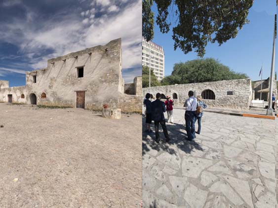 | Fortunately the Alamo has a website that allows you to do 'side by side ' - 1836 versus today which really helps me get a better idea of how things really looked. You can rotate around 360 degrees. This is the view looking at the mission itself. | ||