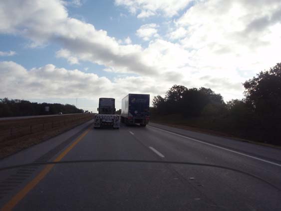 | But as always on the slab, you encounter what I call the 'elephant dance'. It is two semis side by side and neither one has the power to pass the other one. This can go on for miles and miles which is pretty frustrating and causes dangerous backups of other vehicles behind them. | ||