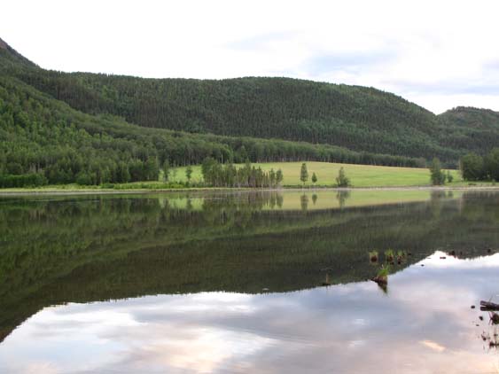 | Since this place advertises about all the wildlife and there is no good place to walk except the highway, I take the lazy choice this morning. It will be a fairly long day - 480+ miles and I figure the temps will begin to rise. I walk out a little bit and I do enjoy the pretty lake view. | ||