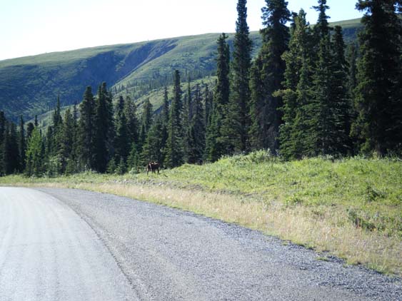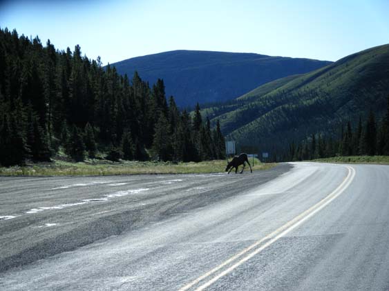 | and baby Mooses are on this side at the salad bar. Being raised in the country, I know what's gonna happen if I try to ride between them - I'll have my very own set antlers on my handlebars. So since discretion is the better part of valor, I ease up just a little and make some racket. I'm hoping I can get some of the attention of Momma Moose without a full inspection. My ruse works and she goes rushing across the highway to her babies and we go rushing past them before she decides to return to the salt bar. | ||