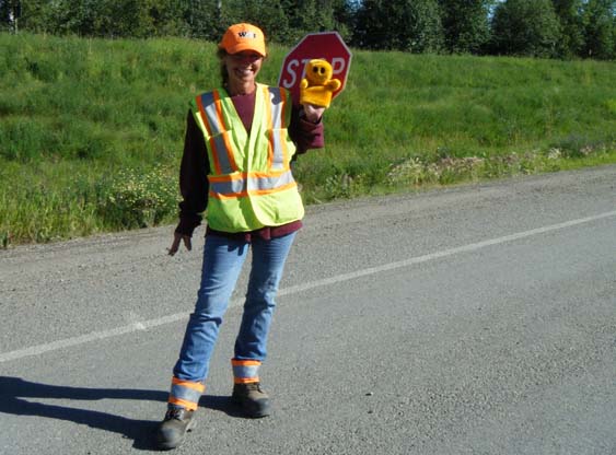 | The flag lady here agrees to pose with Mr. Happy since it's pretty quiet while we wait for the pilot vehicle. | ||