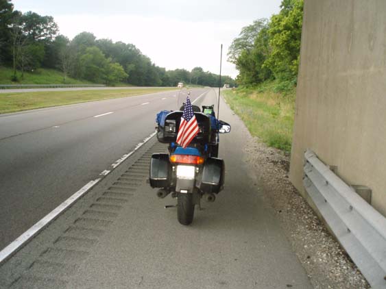 My predictions of rain are true and fortunately I find a bridge to stop under so I can gear up for the coming storm. A Harley Davidson rider who I'd been swapping the lead back and forth pulls over to make sure I'm okay. "Yeah, I'm just stopping to put on rain gear. But I really appreciate you checking on me. Where you headed?" He replies "Back to Missouri." "Well be careful, you've got a bit of haul" I tell him. Then he's off and I'm about the business of get suited up. |