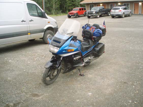 | They are just headed to Valdez for the day so they decide to proceed. I want to reposition BlueBelle to get a shot of her with the waterfall. But before I can say 'What happened' my right foot slips on the fine, wet sand that I don't notice under foot. Poor BlueBelle is laying on the ground on her right side with a busted mirror, busted mirror cover and me beside her. Fortunately Rick and Connie see what has happened and do an about face to come back. They and a kind gentleman there with his family help me get her back up. I'm hurt but I'll be okay though I am aggravated at busting my right mirror. | ||
