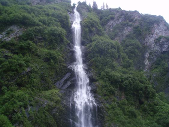 | The most scenic part of the ride into Valdez is what they call the 'canyon' where there is a narrow passage between the mountains and a couple of nice waterfalls. | ||
