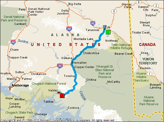 | When I reach this sign my choice is Valdez as I plan to take the ferry out of Valdez to Whittier then from there ride to Seward and Homer. | ||