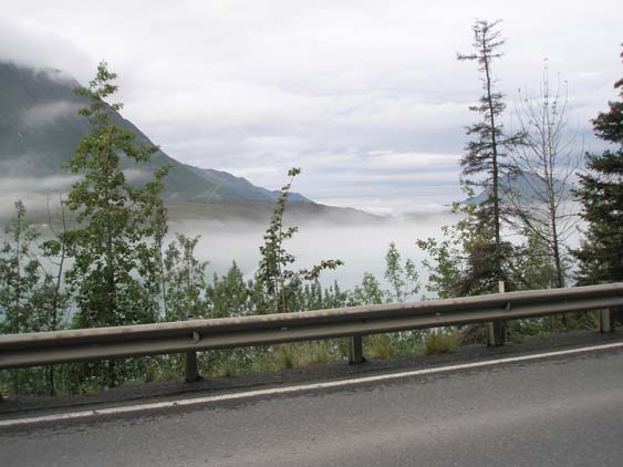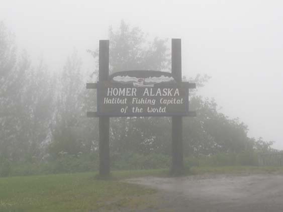 When I come into Homer proper, the fog has rushed up to greet me. A bit of history about the town - Homer was named for Homer Pennock, a goldmining company promoter, who arrived in 1896 on the Homer Spit and built living quarters for his crew of 50 men. However, goldmining was never profitable in the area. |