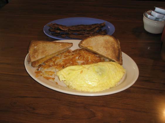 Knowing I am headed for another long ferry ride, I start looking for a place to buy some more ratchet straps as I get into Soldotna. There's an O'Reilly Auto Parts and they have just what I need. The lovely Miss Carolly checks me out and I ask her - "Is there a good place around here you'd recommend for breakfast?" She puts me onto a place down the road a bit and a little out of the way. But I have plenty of time and my stomach is texting my throat to see if it's been cut since it's been a while since anything has come down the chute. |