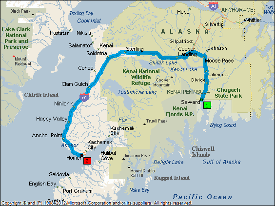 | It's a lovely ride out to Homer - that is if you like snow touched mountains and rugged terrain. | ||