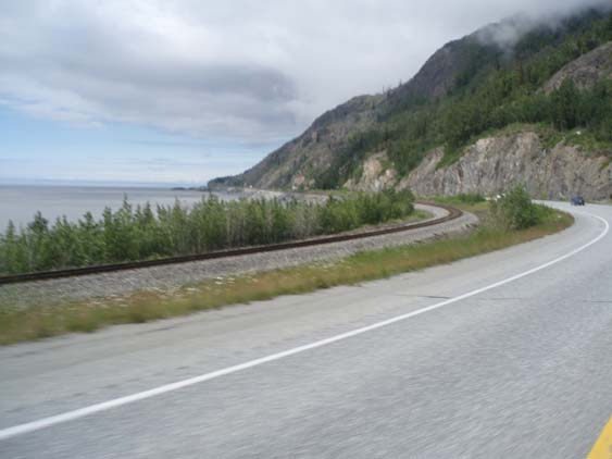 | As I get closer to Anchorage, the railroad accompanies the highway as it makes it's way around the ocean inlet. | ||