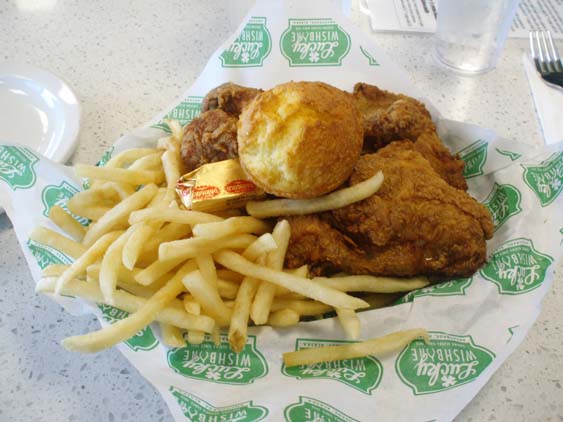 | Pan fried chicken is their specialty and they sure do it up right. They give you enough chicken to flounder a chow hound. | ||