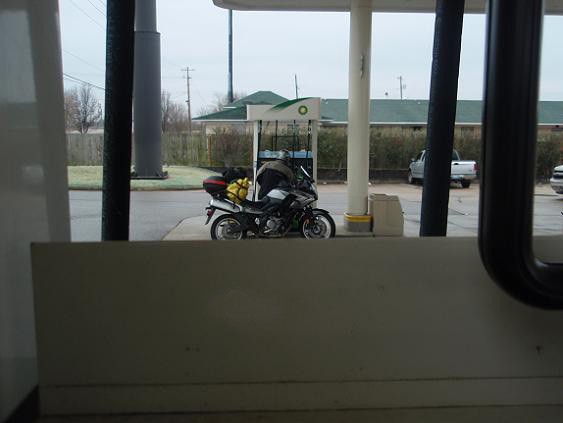 | Just south of Little Rock on I30, we pull off at Benton for our next fuel stop. It's time to 'reevaluate' our gear as the temps are starting to rise. We pack away our heated gear, knowing it's only going to get warmer in Dallas. | ||