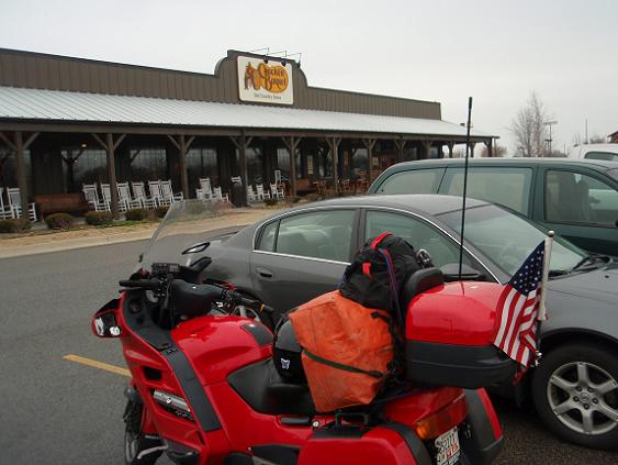It's in the low 30s, so we are both suited up in our heated gear. Andy already had a Gerbing vest so I let him use my 'extra' Widder heated gloves for good measure. I tell him - "There's a Cracker Barrel just before we get into Memphis we can do breakfast. It'll keep us out of the Memphis morning rush hour." Andy is flexible and a good friend - two highly valuable qualities when you are on the road and especially in view of what happens later in the day. It's only a few miles to I40 from the Holler, so soon we are clicking off the mile markers on the mother road. This particular Cracker Barrel near Lakeland is a little convoluted to get to, but there's also a gas station on the way in so we make use of it. I always like to make a fuel stop and food stop together if I can cause once I'm rolling I just hate to stop. |