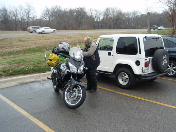 It feels good to get out of the cold for a while and I make good use of the fireplace. The heated gear is working fine, but nothing like a good fire to get your bones really warmed up. Andy pulls in soon, and I wave him over as I head to our table. We order our grub then talk about this trip and our upcoming 'Wild West Ride'. Andy, Dave Whitley from Scotland and I are going to see as much of the West as we can cram into a little more than 2 weeks. So this will be a good test as to how the fuel capacities stack up in actual use before the long ride. Breakfast comes and is quickly dispatched as only two country boys with a fond appreciation of eggs and such can do. Andy gets the check as he tells me - "You got the last one best I remember." "But Andy, you're indigent and out of work!" I protest. We both laugh, but he pays the tab anyway. He got 'Chinasized' right out of his job a while back after many years of service like so many other folks in the current economy. With the paying business done, we're back out into the cold. Andy has added some plastic 'wind breakers' to his V-Strom that are proving very effective on keeping his lower body protected. We know that one of the challenges of this trip is trying to deal with the various extremes in temperatures we will encounter. We will probably be removing layers as the day progresses and we get closer to Texas. |