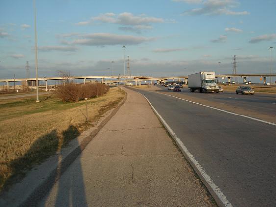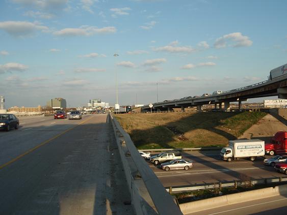 | Assuming he is coming back down I35E to I635, I notice that the ramp is beyond me. Since sitting on this bridge in heavy traffic is not conducive to my longevity, I mount up and move to just west of the north ramp. | ||