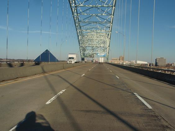 | The miles just click away once we hit I40, a road I could probably ride in my sleep. The bridge across the Mississippi River into Memphis is always a welcome sign to me, cause I know I'm within 200 miles of the Holler. And of course, there's that lovely Pyramid that sits in the river bottoms to greet us. | ||