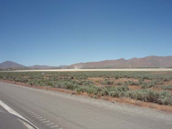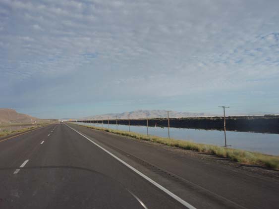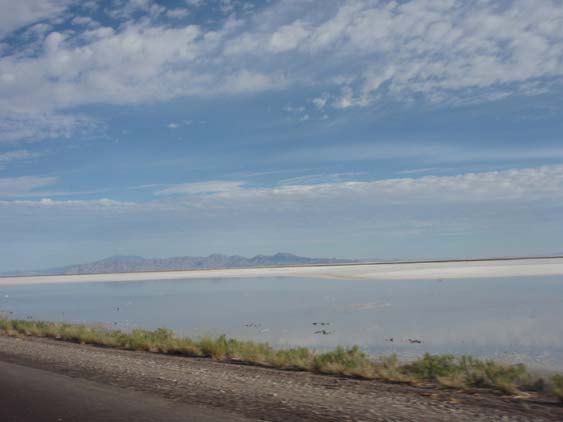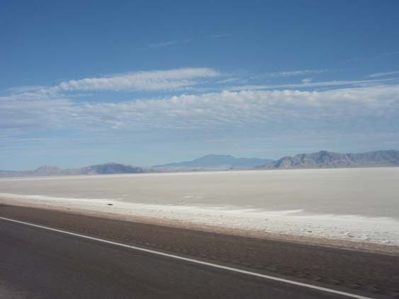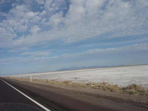 | The clouds almost seem to reflect the whiteness of the salt flats to the north. I'm really thankful that today the crosswinds are almost not existent. The last time I was through here it was a real battle to try to stay upright. | ||