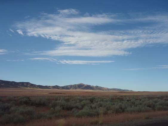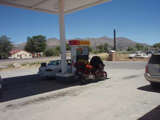 | I finally leave I80 behind for highway 395. Here the wind picks up and it is hot and dry. I finally put into a run down store that has gas since I'm a little lower than I like to be given the area. The woman behind the counter is less than pleasant when I ask her where the bathrooms might be. She directs me to a porta potty out in the parking lot. Now I was raised in the country with no indoor plumbing for the first five years of my life and spent plenty time around barns, cows, and pigs so I'm not real faint of heart or smell. But I ain't never been in an outhouse quite like this one. Between the heat and the fact that it hadn't been emptied in quite while let's just say the mountain was about to reach the seat and the smell would either kill a live man or revive a dead man. So I just pass on the opportunity and figure I'll find a third tree on the left somewhere on down the road. | ||