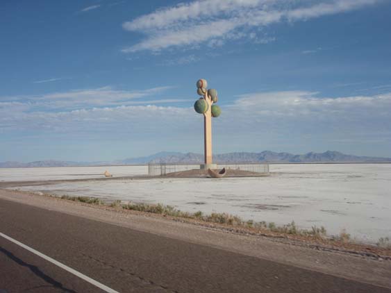 Having passed this 'tree' several times, I finally research exactly what it is. According to Wiki - Metaphor: The Tree of Utah, sometimes called the Tree of Life, is an 87-foot-tall (27 m) sculpture that was created by the Swedish artist Karl Momen in the 1980s and dedicated in 1986. It is located in the desolate Great Salt Lake Desert of Utah on the north side of Interstate 80, about 25 miles (40 km) east of Wendover and midway between the former railroad communities of Arinosa and Barro. The sculpture, which is constructed mainly of concrete, consists of a squarish 'trunk' holding up six spheres that are coated with natural rock and minerals native to Utah. There are also several hollow sphere segments on the ground around the base. The sculpture currently has a fence surrounding the base to protect people from falling tiles. Inscribed on the plaque