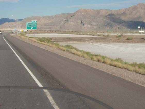| Near the end of the flats, I see the turnoff to 'official' Bonneville Salt Flats Speedway. I can't help but remember my trip to New Zealand and visting the 'World's Fastest Indian' that set a record here in 1967. | ||