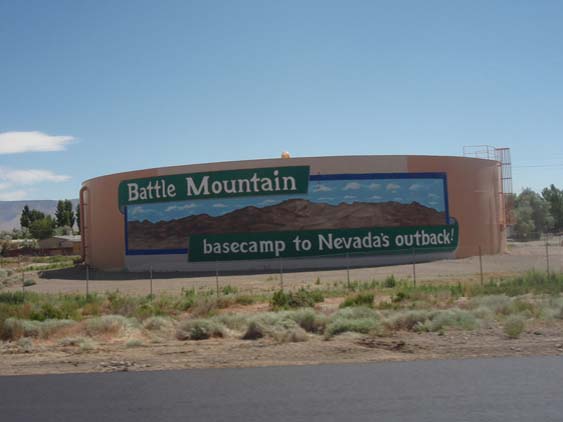 | It's about time for a fuel/hydrate break, so I pull into Battle Mountain. With the temperatures up where they are, I decide I'll have a sandwich and take a longer break. My lips are beginning to crack and I notice a pharmacy on the way in. After tending to business, I stop by the pharmacy and pick up some Chapstick at a handsome price. This water tank greets me on the way out of town. I have been of the opinion that riding in a lot of Australia would be like riding out here so this sort of confirms it in my head. I guess the locals also decided to jump on the Australia connection. | ||