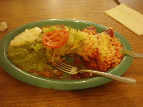 I finally pull into my Super 8 for the day and get checked in. Turning up the air to about the right temperature to put frost on the windows, I shower and cool off for a bit. I decide I'll try a 'sit down' super tonight and see if it turns out any better than last evening. I ask the lady behind the desk - "Anywhere good to eat within walking distance?" "Nothing much on this side of the Interstate" she says "except for a Mexican place over in the little shopping center. It's pretty good." So I hike up my britches and head that way. |