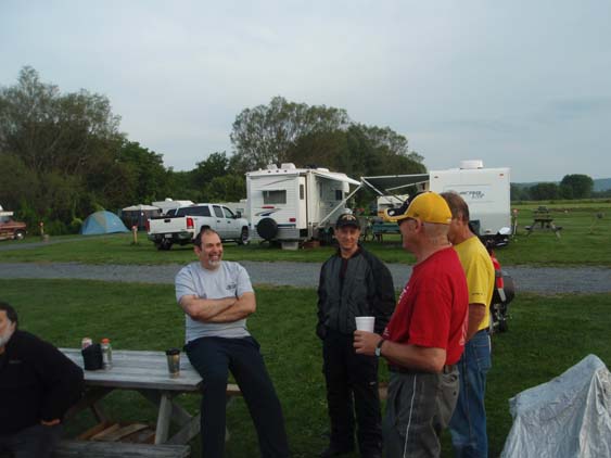 | I wander down to the group camping area to see who's up and get a read on departure time. Most folks have their morning dose of starter fluid in hand, with the Dazzling Ray leading the conversation. | ||