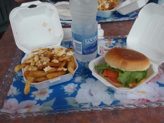 | It is called poutine, cheese curds, gravy and some other stuff poured over french fries. It is a Quebec original version of a fast food heart attack on a plate. You can feel your arteries clogging with each bite. At the end of the day, I think I still prefer good old catsup on my french fries .... | ||