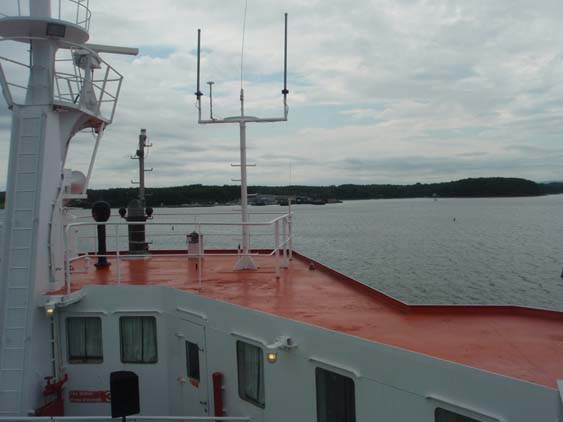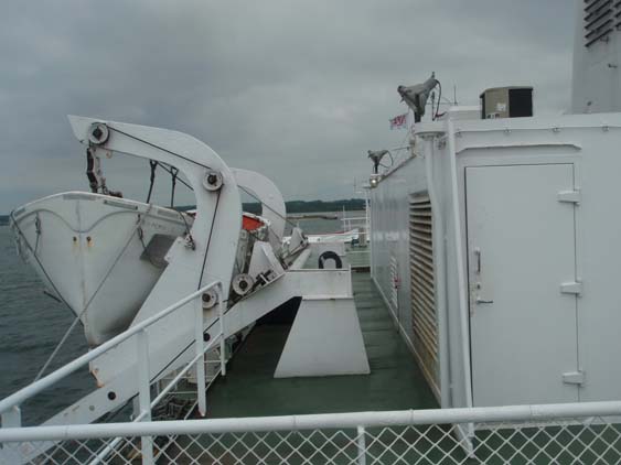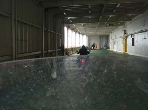 | Soon it's boarding time and we and some other motorcyclists make our way on board. Having ridden seagoing ferries in Europe, this is old hat to me. Some of the other riders have not done it before, so I give them some pointers on how to secure their motorcycles and such. Some of them are talking about staying with their bikes, so I feel that I should warn them - "From my ferry experience in Europe, most ferries of this size make all passengers go up to a lounge. So you might want to prepare for that just in case." They are a bit skeptical at first, until the announcement comes for all passengers to leave the deck. | ||