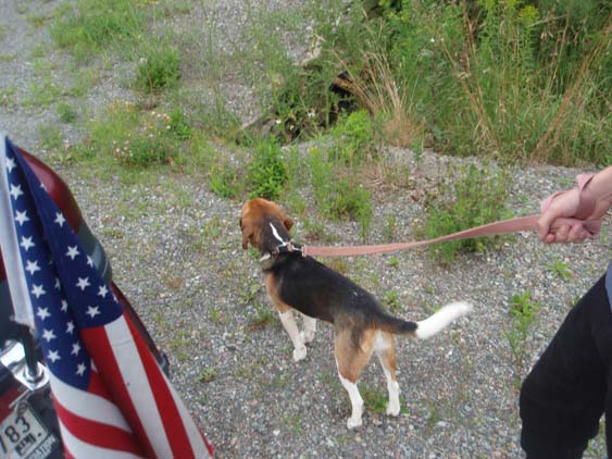 | S we mosey down some backroads, we come across a young feller walking his dog. I stop and ask him, "What's her name?" He replies - "Aya. She's mostly beagle." "Looks like a good rabbit dog to me" I tell him. But the road waits for no one, so we bid him farewell and get back to it. | ||