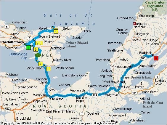 | PEI is a pretty place and it seems folks are just traveling at a slower pace here. I think so much of the world is just busy about being busy and doesn't stop to think about what they are actually doing. This morning all I have to do is follow Alain's taillights - which will be more of a 'challenge' than I now anticipate. | ||