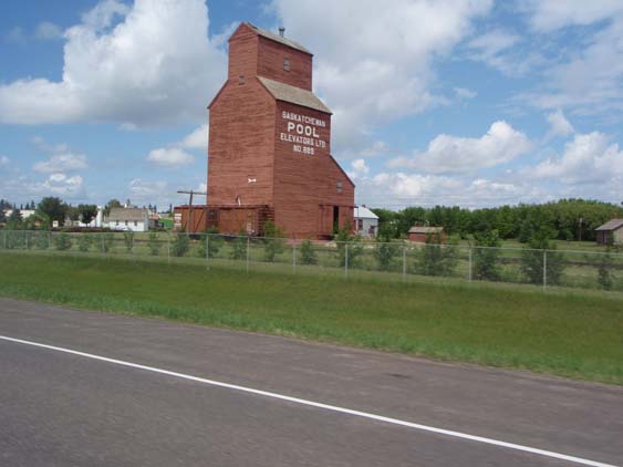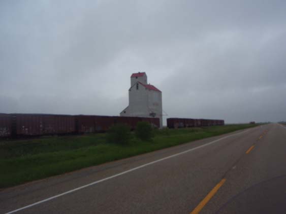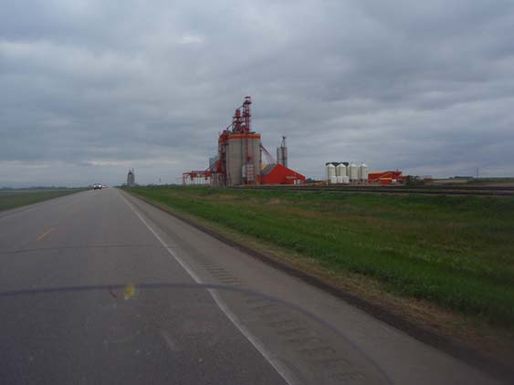 | The large grain elevators are scattered along the road, standing watch by the railroad. Out here, it appears that the railroad plays a much bigger part of the transportation scene than back home. | ||