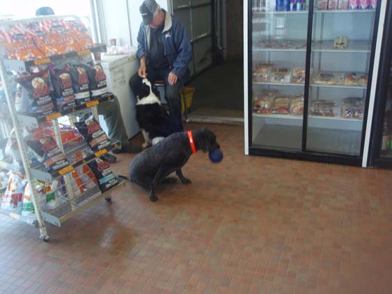 | This happens to be a full-service place, but I pump my own gas out of habit. The attendant comes out and says - "You want me to clean your windshield?" With two days of bug guts and other nasty matter stuck to it, I figure I'd better pass. If it's done wrong, I could end up with a windshield full of scratches. "I appreciate the offer, but I think I'll pass" I tell him. "Where you from?" he asks. "Well, I left Nashville Tennessee Saturday morning and I'm headed for Alaska then out to Victoria." "Man, you're making some good time, I'd say" he adds as I follow him into the store to settle up. This place reminds me a lot of one of the service stations I worked at as a kid. But this one is replete with puppy dogs which always bring a smile to my face. This one wants me to buy him some Dr. Pepper but I tell him he's a bit too young for such a strong libation. He decides that he will seek attention else where since he feels he is digging in such a dry hole. | ||