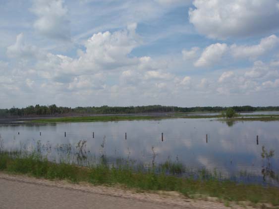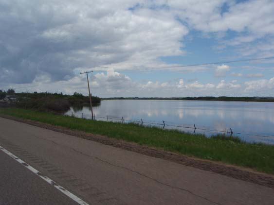 | As I pass this lake, I can't really tell just how deep it is with the fence posts sticking up. There seem to be a lot of this where the lake stretches on and on but not deep enough water for a feller to take a serious swim. | ||