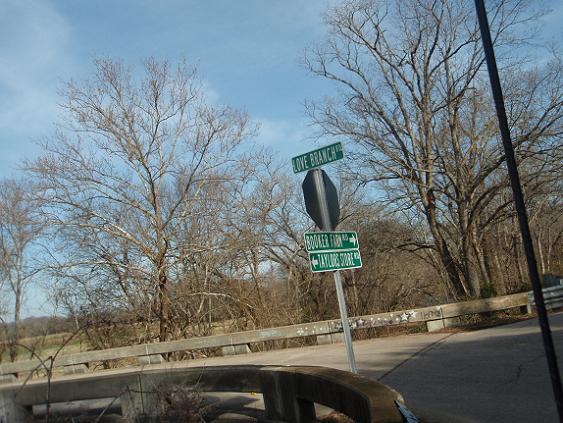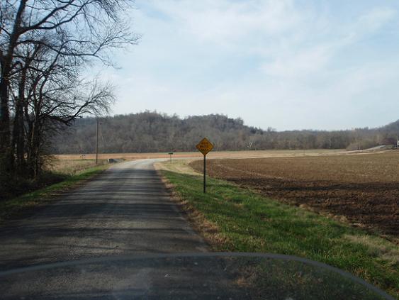 | The nice thing about having a 'road map' in your head is you can explore roads like this and not worry about where they come out. I had a feller ask me one time - "You ever been lost?" "Well, I don't reckon in Tennessee. I just keep riding til I cross a road I recognize" I told him. This road could stand a little maintenance on the surface, but it ain't bad. And judging by the sign, that river over there has gotten up a few times in these fields and over the road. | ||