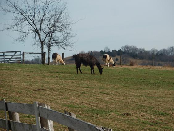 | And sure enough it pops me right out on highway 99/412 just above Hampshire and highway 166. Highway 166, which is a good ride of twisties along a ridge will take me right through Mount Pleasant then a short hop on highway 245 and Yokely Road will put in the big city of Lynnville, population 345. The original city of Lynnville (called Waco) was burned down by the Union Troops around 1864 so they decided to move it a little further away when they rebuilt and changed the name. It is also the home of the Soda Pop Junction, the best place to get a hamburger in the State Of Tennessee! On my way out of town, I notice that one of the locals have started raising llamas. You're liable to see anything out these hills - including ostriches that want to race a motorcycle down the fence line (but then that was another day). | ||