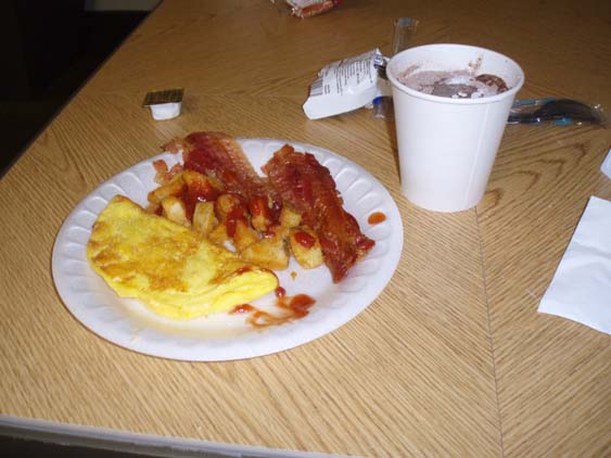 | The LaQuinta has a 'true' hot breakfast with pig meat and hen fruit and some fried taters. Usually 'hot' breakfast means they have a waffle or pancake machine and some sweet rolls and cereal. They also have hot chocolate so I avail myself of that as well. | ||