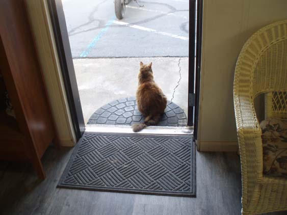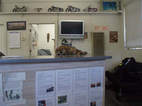 | Jay directs me to come around to the side gate that is open. Once I'm in the office I'm glad to see Mocha - CIC - Cat In Charge - still involved in the business. | ||