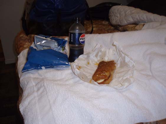 | While I'm getting change I ask the lady - "Anywhere in reasonable walking distance a feller might get a bite of supper?" She directs me down the street for a couple of blocks to a local diner. | ||