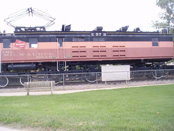 I make a short stop in Harlowton to see the 'last electric locomotive'. The marker reads - The Milwaukee Road 657 mile electrified railroad ended at 11:40 PM June 15, 1974 when Engineer Art Morang stopped the E57B & E34C on the Harlowton roundhouse track. They were the last operating locomotive of the original 84 locomotives built by General Electric in 1915. The electric locomotive roster had totaled 116 locomotives of 5 different types operating from Harlowton, Montana 440 miles to Avery, Idaho and 216 miles from Othello, Washington to Tacoma, Washington over 5 mountain ranges. The E57B is 57' 8 3/4" long and 16' 8" high 10' 0" wide and weighs 144 tons. Rated at 1500 h.p. it could develop 2395 h.p. starting effort, a 62% overload. Operating in 1 to 4 unit consists, they were very trouble free locomotives. Their 3000 volt D.C. trolley restricted them to a small portion of the 11,248 mile railroad and they were replaced by the more versatile diesel electric locomotives.