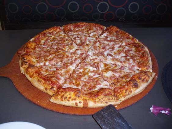 | Once again figuring there are no reasonable breakfast opportunities, I order a pizza with ham and bacon - the perfect breakfast meats. Since I have a microwave back in the room, that will work nicely for supper and for breakfast in the morning. | ||