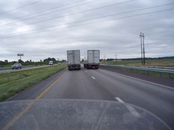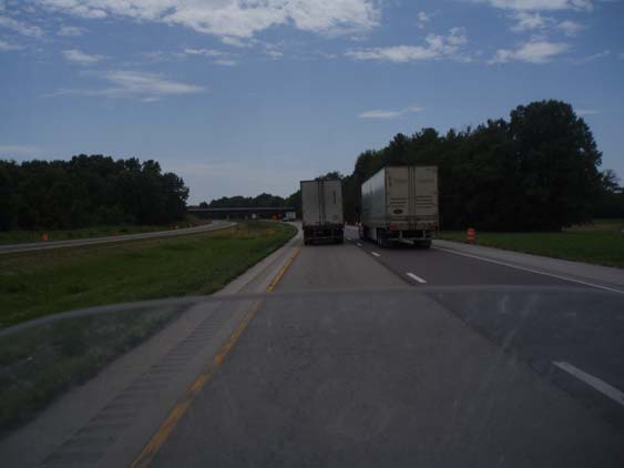 | As I make my way homeward, I once again get to watch what I call an 'elephant dance' where one semi can't seem to get up enough speed to pass another one. Unless the 'passee' relents and lets the 'passer' ahead this can go on for miles and miles as traffic backs up behind them. | ||