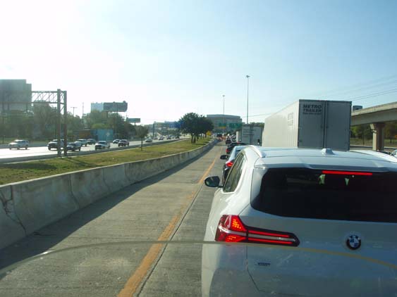 | But as I10 nears I35 there is major construction going on which creates a real train wreck. There are several two lane into one lane merges and it seems that drivers seldom can cope with it. I am only 4 miles from my desired exit but it takes me as long to cover those 4 miles as it did to get the 70 miles to this point. | ||