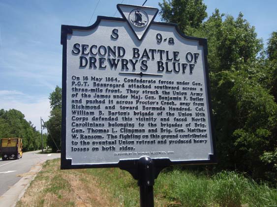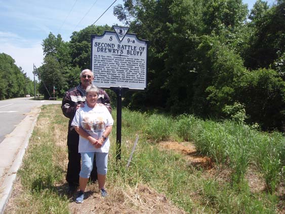 | Later in the morning we arrive at the the marker for the next battle site - the Second Battle of Drewery's Bluff. And interesting point of history - at the First Battle of Drewery's Bluff the Monitor and the Merrimac - the first naval ironclads - fought to a stalemate. The second battle was not a naval battle but a land battle that stretched across a 3 mile front. | ||