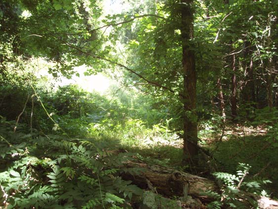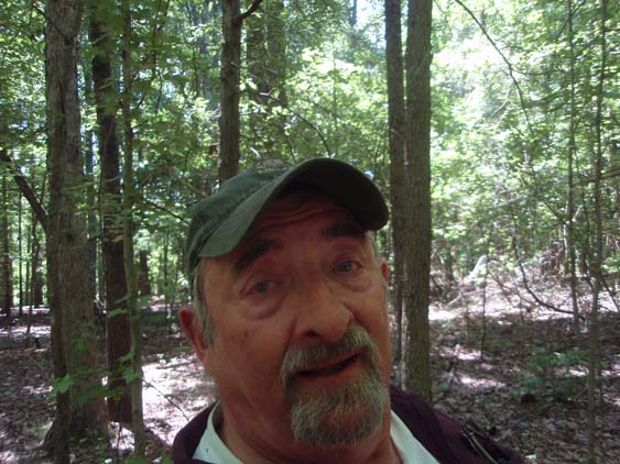| Andy has entered the coordinates of the Shand House for me in his ETrek which is a hiking model. With it, I should be able to get within feet of the location. Because of the dense and tangled undergrowth, Sissy and Andy wisely decide to stay put while I proceed ahead. I find myself questioning my own decision as it is an area of dense, tangled wild grape vines that grab at your feet and trip you. More than once I find myself lying on the ground, thankful that I haven't broken any body parts yet. | ||
