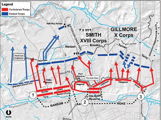 and elaborate plan and Beauregard was supremely confident in it. Fort Stevens was to be the center of attack with Hagood's South Carolinians posted there. Barton's (now under the command of Colonel Birkett D. Fry) Brigade was posted to the east of the fort, with the Lewis' Brigade to their left. In front of Barton's Brigade was Terry's Brigade and Gracie's Brigade was in front of Lewis'. When visibility finally reached a minimum for operations Ransom ordered his division to advance. Ransom hit the Federals like a thunderbolt at 0445 to deliver a hammer blow to the right wing of the Army of the James. Gracie's Brigade stepped off first, followed by Terry's, then Lewis', and finally Barton's following several hundred yards behind Lewis'. Placed well in front of the main line, the 9th New Jersey of Heckman's Brigade was the first to see the Confederates emerge out of the fog and opened on them with musket fire before falling back to their position along the main line. However, in falling back, the 9th New Jersey opened up a gap exposing the entire right flank of the Federals and Gracie's Brigade was closing in. The entire right end of the Union line collapsed in confusion. A follow on assault by Hagood and Johnson met much stiffer resistance but still the blue line was pushed back. The 23rd, 27th, and 25th Massachusetts regiments stood firm and fired repeated volleys into Gracie's ranks. This stopped his advance and caused the Confederates to lie prone in order to avoid being hit. Ransom's hammer blow, thus far, was barely a pinch. Gracie asked Terry to bring his brigade forward in support. Advancing down the Old Stage Road (modern Coach Road), Terry's Brigade hit the 9th New Jersey again. The 1st and 7th Virginia outflanked the 9th New Jersey and caused the regiment to break. The Massachusetts regiments had been holding their own against Gracie and Terry but soon they began to break and fled for the rear. The 25th Massachusetts tried to fix bayonets and attack the Confederates. However, the fog, prevented them from having a decent line of sight and with Confederates all around them, the attack fell apart and became a rout. Lewis' Brigade came under devastating fire from Wistar and Wead's Brigades. The brigade became disoriented in the fog with two regiments moving southeast and two to the southwest. To make matters worse for them, the Federals to their front had strung telegraph wire around tree trunks so that the wire was raised shin high. The Confederates got "tripped up, tangled up, and eventually shot up, stopping their advance." Fry's (Barton's) Brigade came forward and filled in the gap created by Lewis' split brigade. Unfortunately, his brigade hit the telegraph entanglements that snared Lewis' Brigade and thus, met the same fate. All they could do now was attempt to stand up and fire back. Eventually their situation deteriorated so badly, that Ransom had to ask Beauregard for reinforcements in order to help Fry (Barton's) and Lewis' Brigades from faltering completely. Beauregard sent Colquitt's Brigade of Georgians to support Lewis and Fry (Barton). Each subsequent Confederate brigade that moved forward was greeted by telegraph wire. By 6am, Ransom's attack was petering out. The Confederates had suffered heavy losses, became disorganized by the persistent fog, were exhausted, and their ammunition was almost depleted. The men had managed to chip a chunk out of the Federal right, but it was not bent back on its center as was originally planned. Heckman's Brigade had been routed and Heckman himself was captured when he wandered into a group of Virginians. While Ransom's Division was being decimated by musket fire and telegraph wire, Hagood's South Carolinians stationed in Fort Stevens came under severe Federal artillery fire. Blinded by the fog, but thinking Ransom's Division was bending in the Federal right, they vacated the fort and moved forward. They soon found that not only was Ransom's Division not moving the right flank in, Ransom's Division had virtually ceased to exist. Moving ahead anyway, the South Carolinians soon became tangled in telegraph wire in front of Wistar's Brigade, which soon opened fire into the struggling Confederates. Hagood's South Carolinians were savaged in the days fighting. The brigade reported 664 casualties for their effort, by far the most of any Confederate brigade. His division struggled to move back to their outer entrenchments. Ransom saw what was happening and sent his only remaining regiment left in to help. This secured Hagood's left flank. Despite this, Johnson's