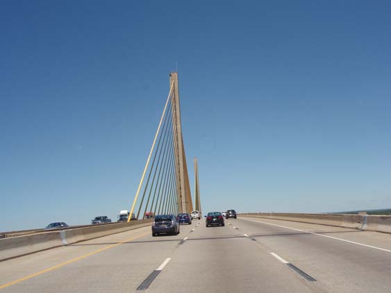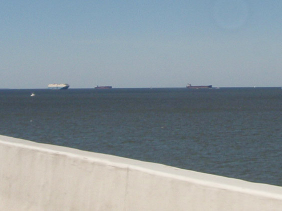 | Finally the boa constrictor of traffic digests its prey and we get back into the two necessary lanes for crossing the long bridge. As I pass, I see several ocean going vessels anchored in the distance. | ||