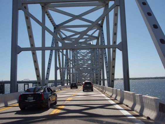 | The bridge is an old iron and girder design which surprises me a bit considering the long distance the bridge covers. But I guess when you are more interesting in collecting revenue than using it, that sort of stuff naturally occurs. | ||