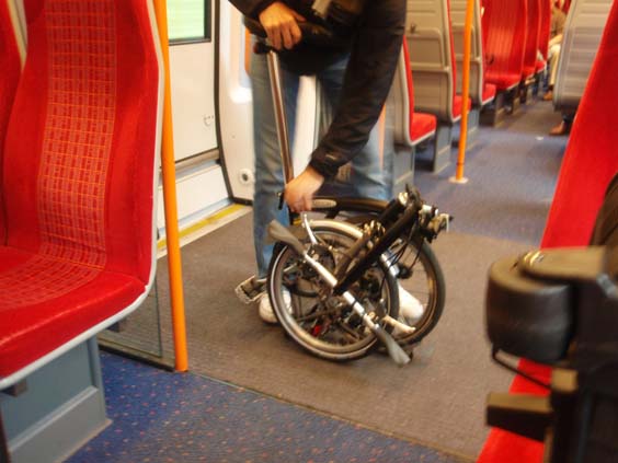 Not many folks are traveling at this time of the morning, so we pretty much have the pick of seats. A fellow rider gets on with this neat, fold up bicycle. I tell him - "That's one of the slickest rigs I've seen in a while.". "Yes", he tells me "I ride it to work from the train, then fold up and tuck it under my desk." You can tell that it is very well thought out and very well made. "I wouldn't do long distances on it, but it is really splendid for commuting" he adds. |