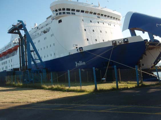 At check in, it appears that I will need my passport which I cannot find now. I fear that I have left it in the luggage back at AboutTown. Sharyn, being much more organized that me, has hers handy and gives it to me. I decide I'll just have to wing it on my charms and my Tennessee driver's license since the departure time is looming. Fortunately, my charm must be working, as the lady checks us in and points us to the Julia, our ferry to Ireland. |