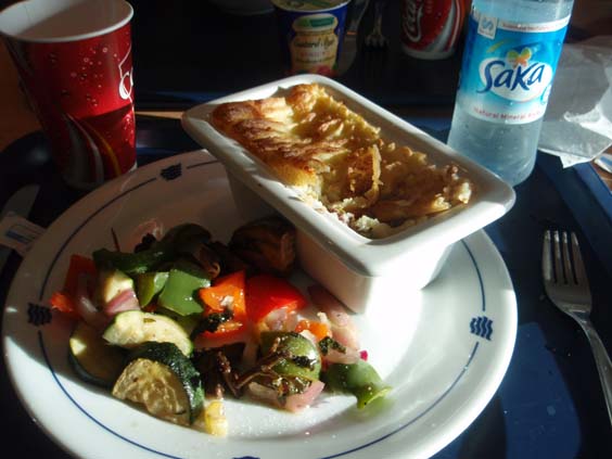 | There are two restaurants on board - a fancy, foo-foo one, and one for us regular folks. The 'regular folks' one has a nice variety to chose from and I chose a 'cottage pie' and some nice veggies. I've always liked 'shepherd's pie' so I figure it is a close cousin and it is. (I later learn that 'shepherd's pie is usually made from lamb and 'cottage pie' is usually made from beef.) Sharyn picks out a nice shrimp salad that looks very tasty. She is also introduced to 'fizzy' and 'no fizz' water as she gets the 'fizzy' kind by mistake, going by the label. I give her the short introduction, which she files away for future reference. She doesn't care for it, so I share my drink and we finish up supper. | ||